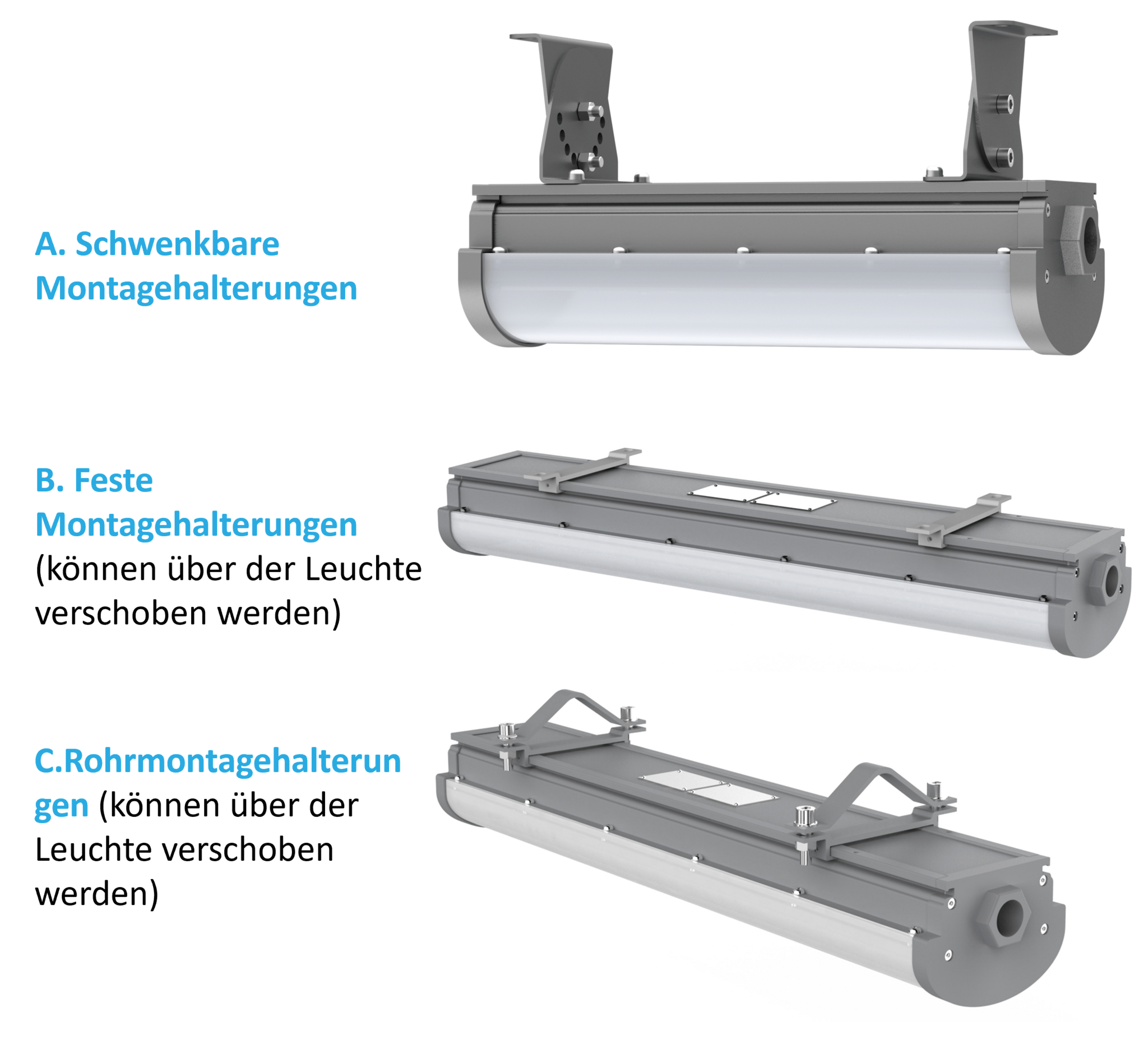 Die ATEX Tri-proof LED-Leuchte wird mit Befestigungswinkeln geliefert, mit denen sie einfach montiert werden kann. Mit diesem Winkel lässt sich auch der Winkel der Leuchte leicht einstellen.